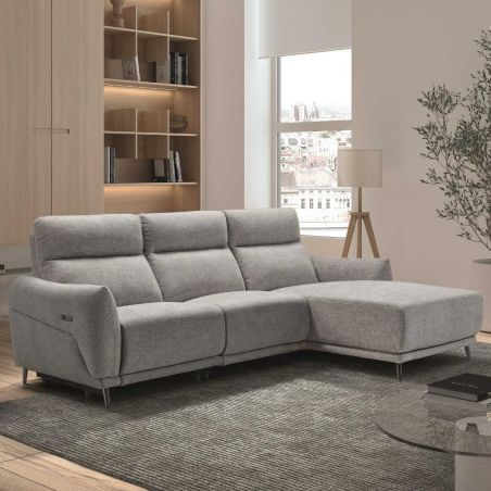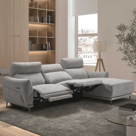 Canapé 3 places relax électrique avec méridienne droite tissu polyester chiné gris clair - SANTIAGO.