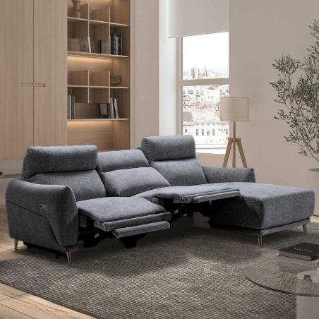 Canapé 3 places relax électrique avec méridienne droite tissu polyester chiné bleu-gris - SANTIAGO.