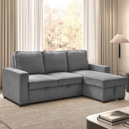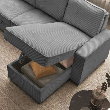 Canapé d'angle droit convertible avec 1 coffre velours côtelé gris - NAPOLINO.