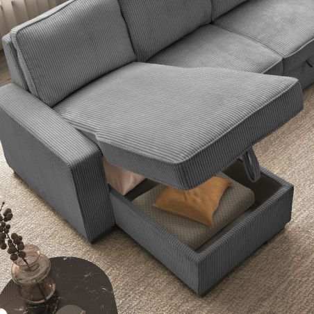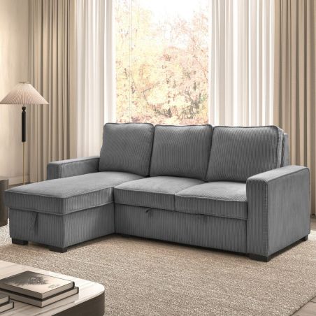 Canapé d'angle gauche convertible avec 1 coffre velours côtelé gris - NAPOLINO.