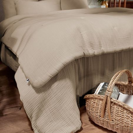 Fabrication 100% Quadruple gaze de coton - 220 gr/m² - Filling 300 gr/m². Garnissage 100% polyester. Lavage 30°C. Pas de sèche-linge.