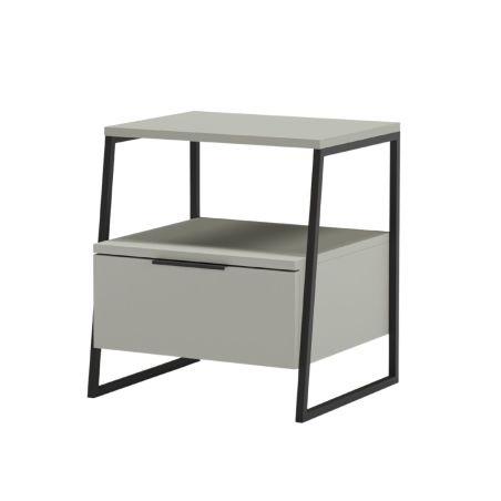 Ajoutez une touche de design industriel chic à votre chambre avec cette table de chevet compacte et élégante. Sa structure métallique graphique et son caisson flottant offrent une solution de rangement à la fois pratique et visuellement légère.