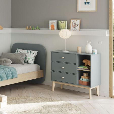 Commode 2 tiroirs et 2 niches en pin massif et MDF laqué vert kaki et naturel - KAINA.