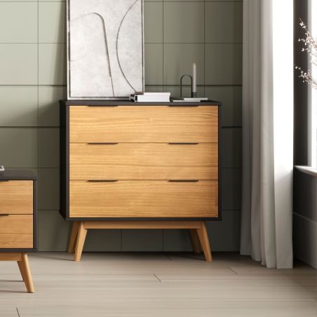 Commode 3 tiroirs en pin massif ciré et teinté noir - VIKOV.