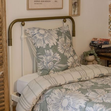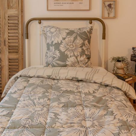 Couette imprimée 140x200cm + 1 taie d'oreiller 63x63cm coton imprimé recto floral verso rayé vert sauge et blanc - TAMIA.
