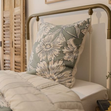 Insufflez une bouffée d'air frais et de poésie naturelle à votre chambre. Ses imprimés floraux généreux sur un fond vert sauge apaisant, et au verso ses rayures fines et authentiques, offrent un équilibre parfait entre caractère rustique et modernité épurée.