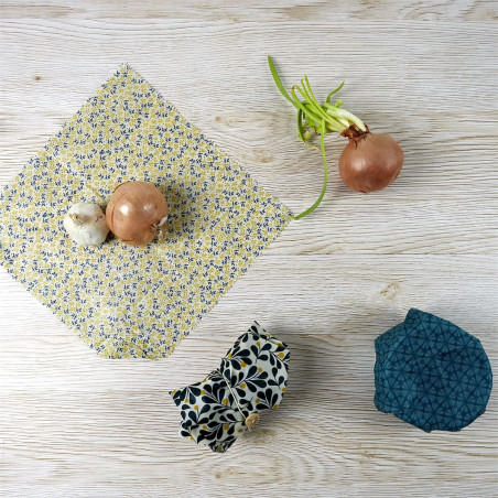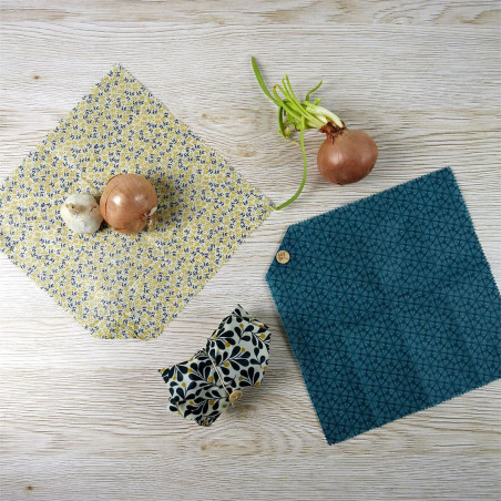 Conçus en tissu enduit à la cire d'abeille. Lavables et réutilisables ! Fermeture avec bouton.