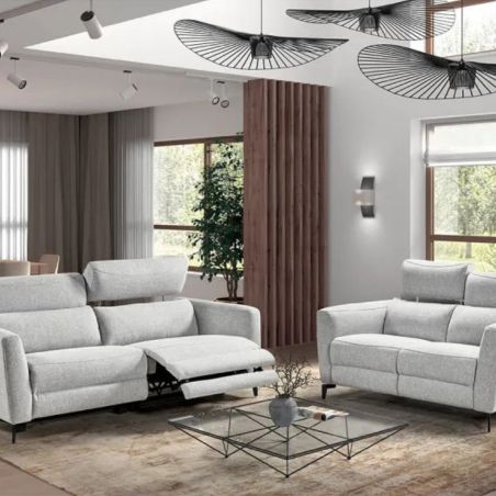 Système Relax (Canapé 3 Places uniquement) : Mécanisme relax électrique. Résistance mécanisme maximum : 120kg. Connexion avec transformateur. Système électrique incorporé grâce à un bouton latéral pour ouverture et inclinaison du repose-pieds et du dossier avec arrêt multiposition. Têtières multipositions réglables avec les boutons sur le côté de l'accoudoir.