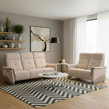 Ensemble canapé relax électrique 3 places + canapé fixe 2 places tissu maillé beige - AUSTRAL. Cette gamme Austral adopte un look contemporain qui trouvera sa place dans les intérieurs les plus exigeants, et offrira un confort de relaxation optimal.