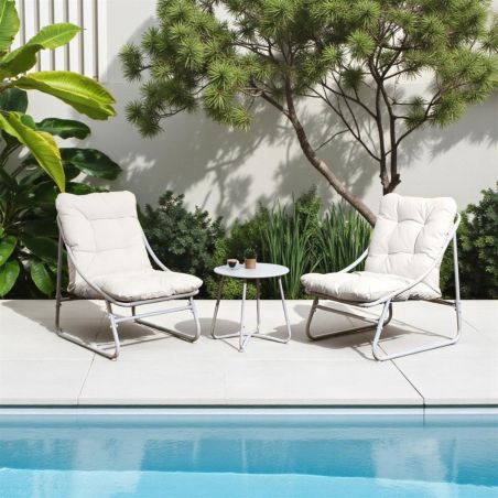 Les lignes fluides et épurées des fauteuils dessinent une silhouette moderne et accueillante, tandis que la petite table coordonnée complète l'ensemble avec discrétion.