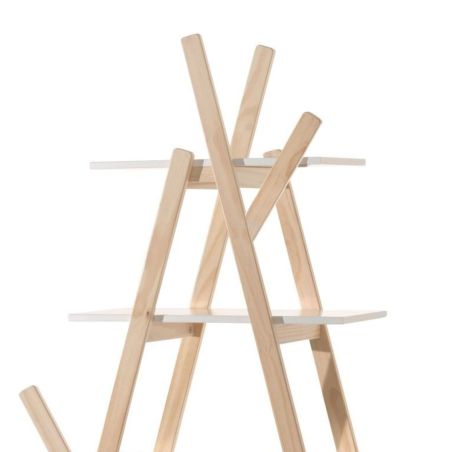 En mdf satiné et pin massif en forme de tipi. Dispose de 5 tablettes.