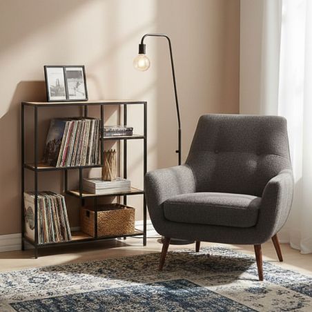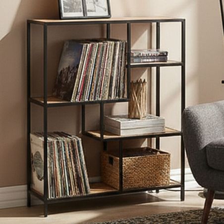 Structure en acier laqué noir satiné, étagères en manguier massif issu de la gestion contrôlée des forêts, finition vernis nitro cellulosique.
