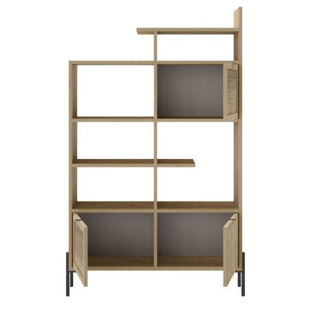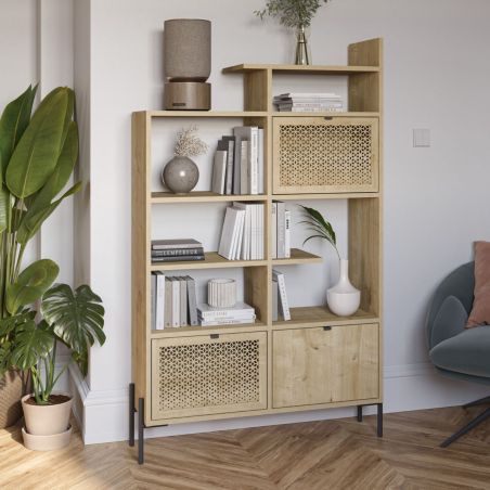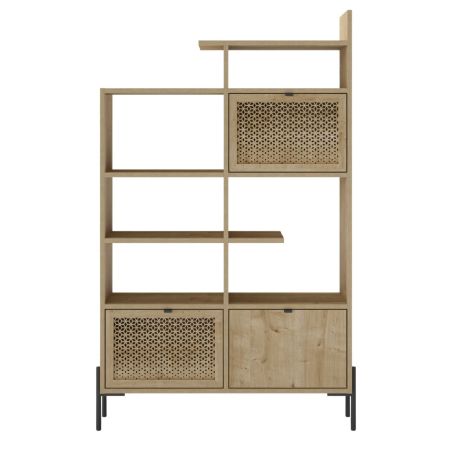 Etagère bibliothèque 3 portes en mélaminé imitation bois clair avec 2 portes sculptées piètement métal noir - MELISSA.