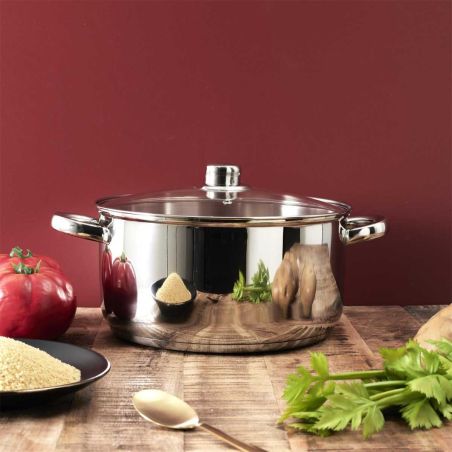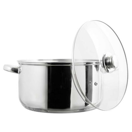 Faitout en métal de 7L avec couvercle en verre, compatible avec tous les types de feux, y compris induction, et passe au four sans le couvercle.