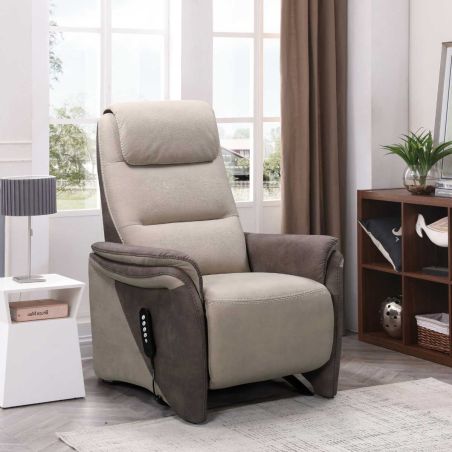 Fauteuil relax électrique releveur tissu polyester micro peau brun et mastic - NADIR.