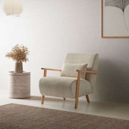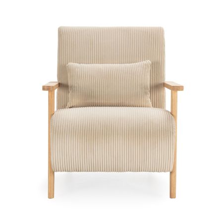 Fauteuil en velours côtelé beige vintage avec accoudoirs et pieds en chêne naturel - BONIFACE.