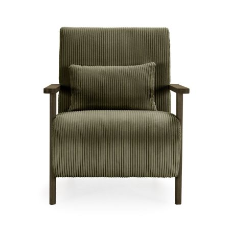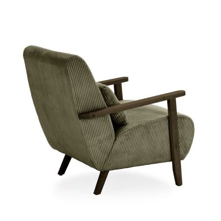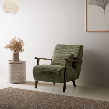 Fauteuil en velours côtelé vert vintage avec accoudoirs et pieds en chêne foncé - BONIFACE.