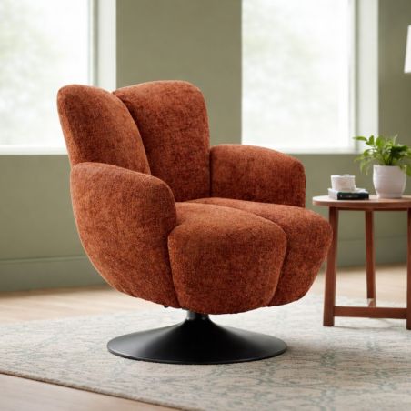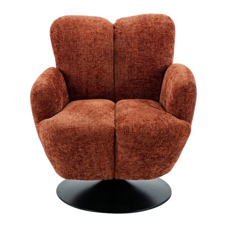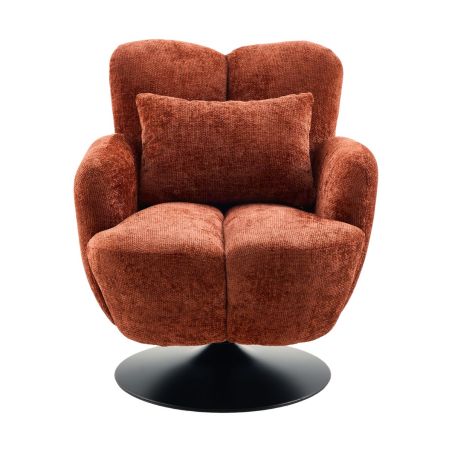 Fauteuil lounge pivotant avec accoudoir en tissu chenillé terracotta piètement socle métal noir - GOTHAM.