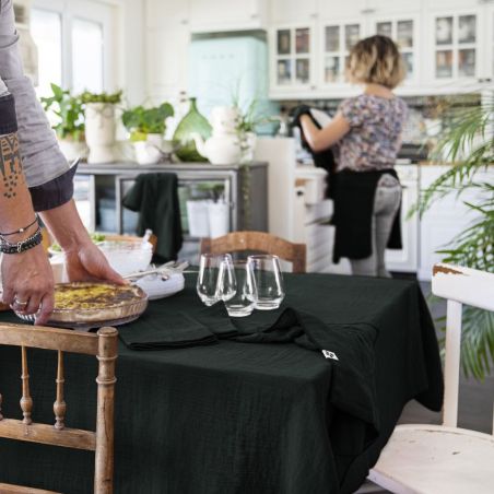 Une nappe douce à l'aspect gaufré et au tombé élégant, qui embellira votre table. Sa teinte vert-bleu foncée, légèrement grisée est très élégante et naturelle.