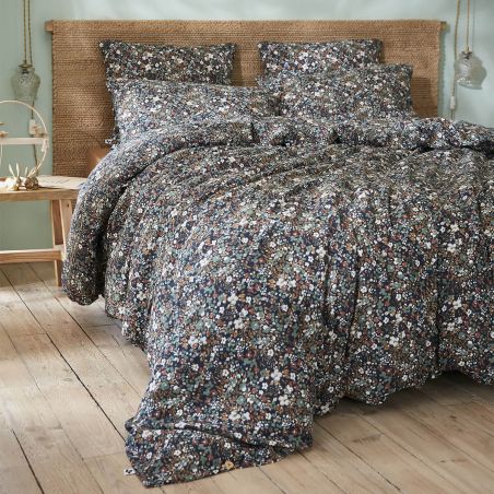 Housse de Couette 260x240cm Gaze de Coton Fond Bleu Motifs Fleurs de la gamme Adonis.