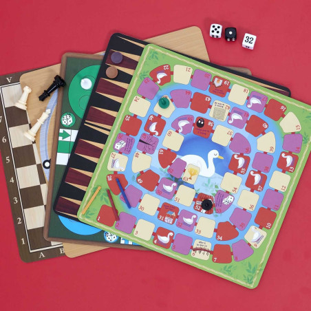 Jusqu'à 100 jeux possibles à composer avec 10 plateaux de jeux, jetons, dés, pions, etc...