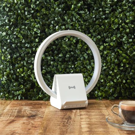 Lampe chargeur induction 5W avec enceinte, permettant de charger votre téléphone sans fil tout en diffusant vos musiques avec un effet LED arc-en-ciel.