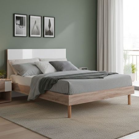 Lit 160x200cm tête de lit blanche et cadre aspect bois - YAKIM.