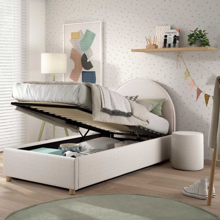Une gamme cocooning à souhait avec son revêtement bouclé et sa forme apaisante, offrant un espace de rangement conséquent grâce à son coffre sous le couchage.