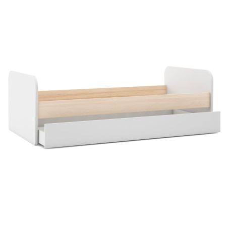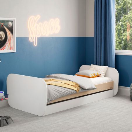 Lit 90x190 avec tiroir tête et pied de lit arrondis en pin massif naturel et MDF laqué blanc - KAINA.