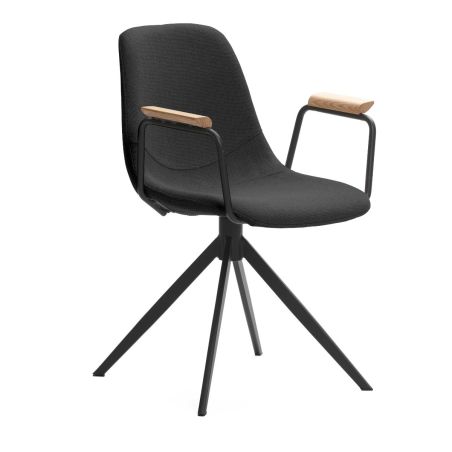 Les accoudoirs sont une caractéristique clé, combinant un cadre tubulaire en métal noir avec des manchettes en bois clair. Cette touche de bois ajoute de la chaleur et un détail tactile très apprécié.