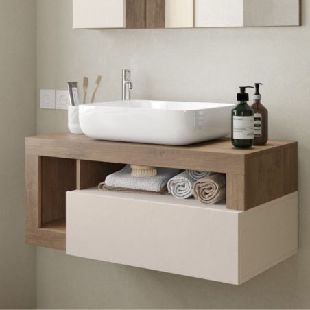 Meuble Vasque 92cm suspendu 1 tiroirs beige laqué et aspect bois finition Mercure de la gamme Arturo.