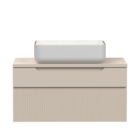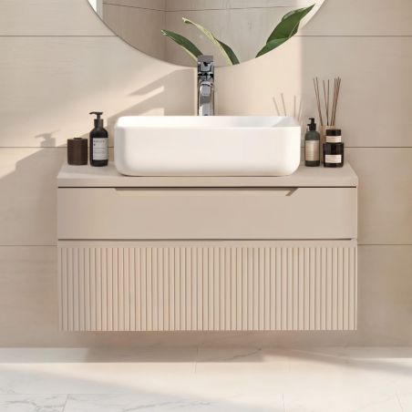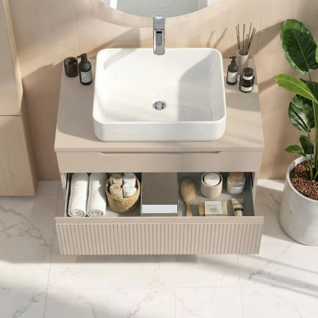 Meuble Vasque 80cm suspendu 2 tiroirs beige façades relief à stries verticales - JANEIRO BEIGE.