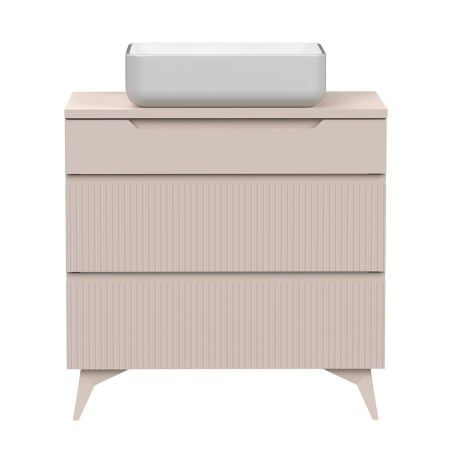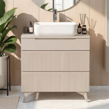 Meuble Vasque 80cm 3 tiroirs beige façades relief à stries verticales pieds métal - JANEIRO BEIGE.