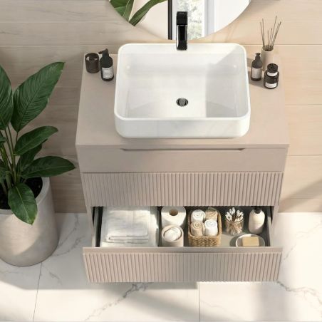 Un meuble de salle de bain qui joue sur les textures, Alliant un design contemporain et une finition cannelée ultra-tendance, ce mobilier apporte une dimension sculpturale et apaisante à votre espace de soin.