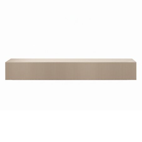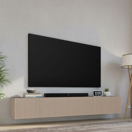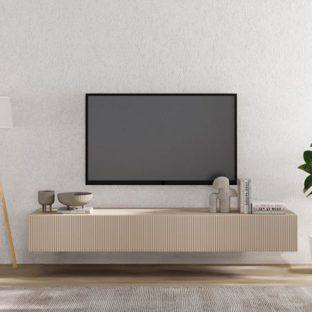 Meuble TV suspendu 180cm 1 porte abattante relief laqué beige.