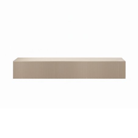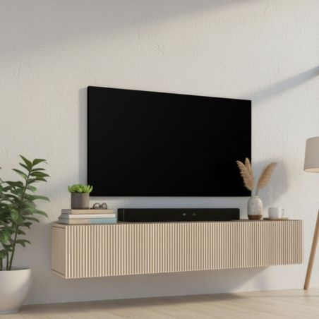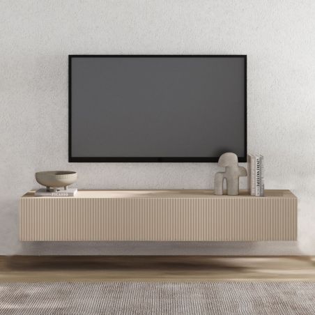 Meuble TV suspendu 160cm 1 porte abattante relief laqué beige.