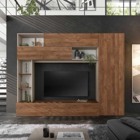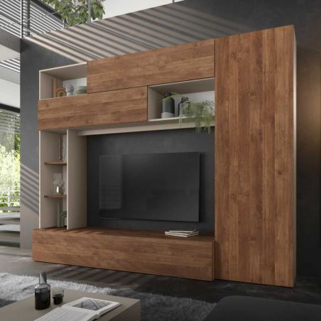 Meuble TV mural avec rangements et étagères beige et aspect bois de la gamme Palacio.