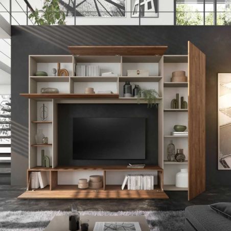 Ce meuble TV design bénéficie de nombreux rangements, portes, niches et étagères qui se prêtent aussi bien à votre équipement TV qu'aux livres ou aux objets de décoration.