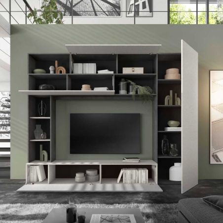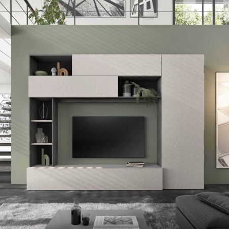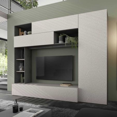 Meuble TV mural avec rangements et étagères aspect pierre grise de la gamme Palacio.