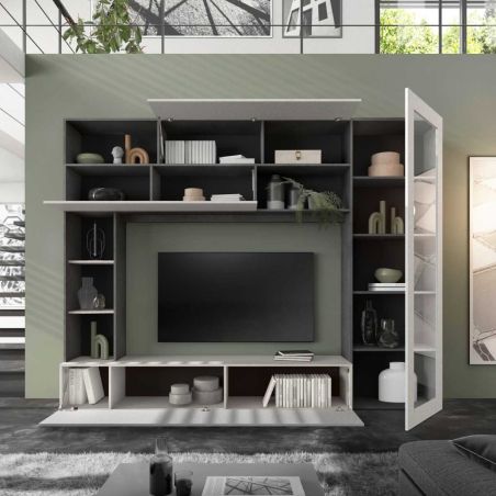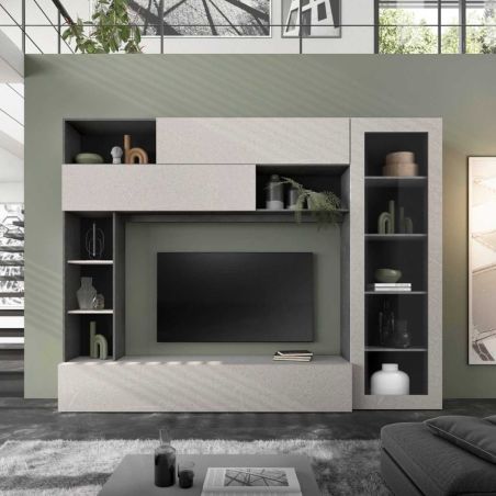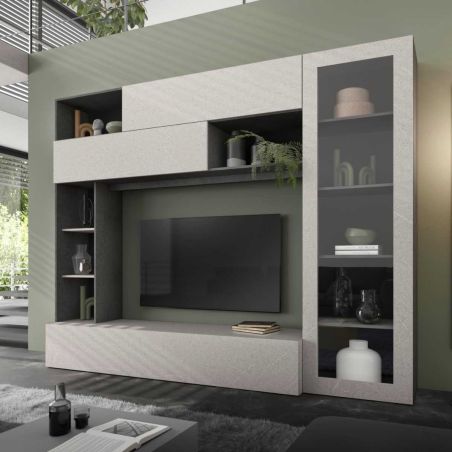 Meuble TV mural avec rangements 1 porte vitrée et étagères aspect pierre grise de la gamme Palacio.