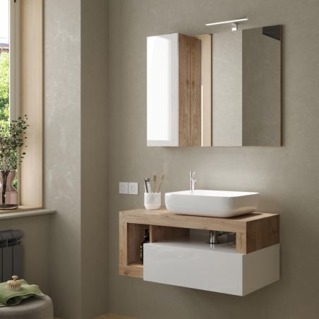 Meuble Vasque 92cm suspendu 1 tiroirs blanc laqué et aspect bois finition Cadiz de la gamme Arturo.