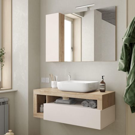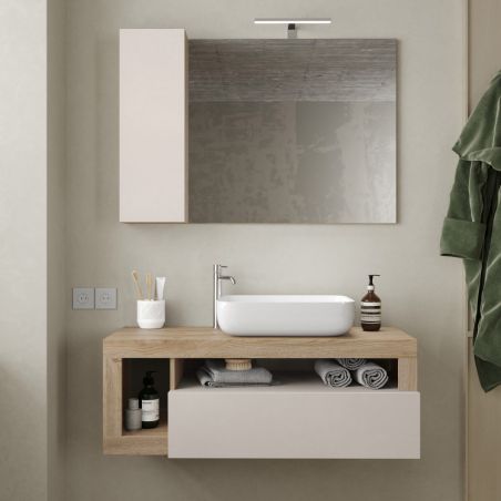 Meuble Vasque 110cm suspendu 1 tiroirs beige laqué et aspect bois finition Cadiz de la gamme Arturo.