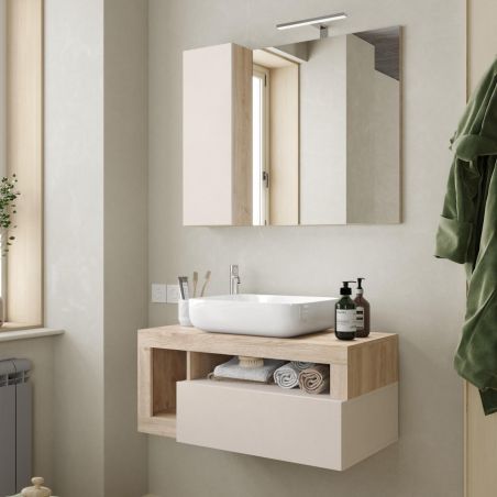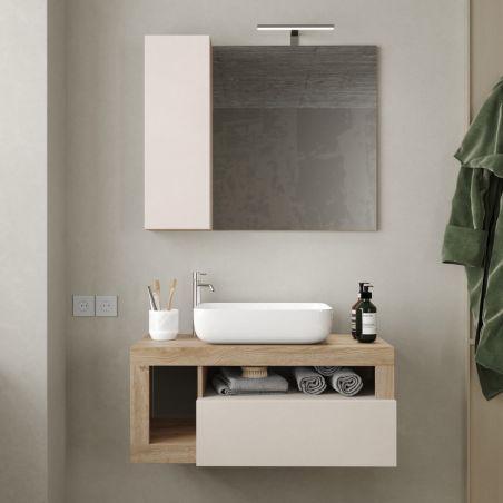 Meuble Vasque 92cm suspendu 1 tiroirs beige laqué et aspect bois finition Cadiz de la gamme Arturo.