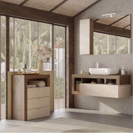 • ARTURO - Meuble Vasque 110cm suspendu 1 tiroir beige laqué et aspect bois finition Mercure