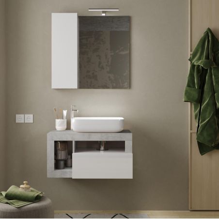 Meuble Vasque 78cm suspendu 1 tiroirs blanc laqué et aspect béton de la gamme Arturo.