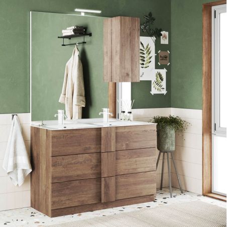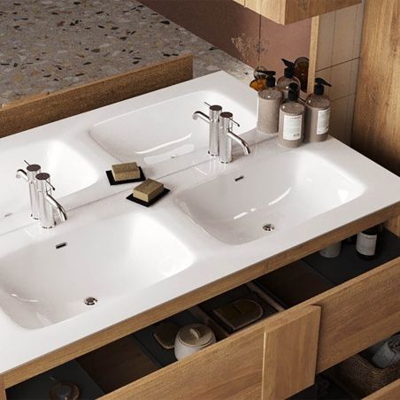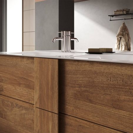 Conçu en panneaux de particules haute densité. Revêtement mélaminé aspect bois de première qualité. Vasque en céramique.