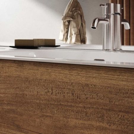 Conçu en panneaux de particules haute densité. Revêtement mélaminé aspect bois de première qualité. Vasque en céramique.