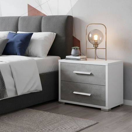 Chevet 2 tiroirs blanc laqué façades aspect ciment pieds et poignées chromées - MIRAE.