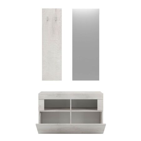 Ensemble comprenant un portemanteau et un miroir muraux et un meuble à chaussure avec une porte basculante permettant de stocker 4 paires de chaussures.