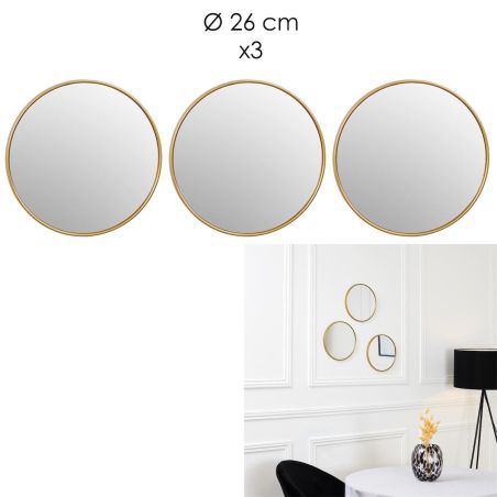 Lot de 3 miroirs ronds Ø26 cm avec cadre doré, parfaits pour une décoration murale élégante et raffinée.